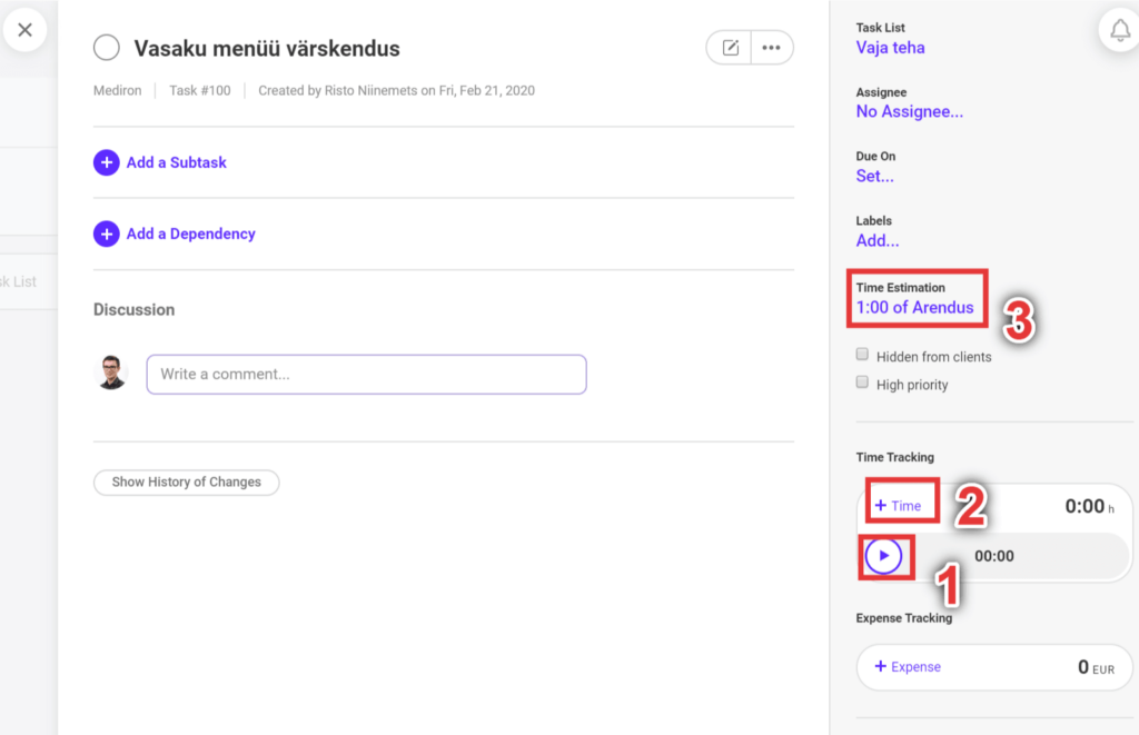 Oma töödele kulunud aega jälgime ActiveCollabis, kus on sisse ehitatud ka timer. Iga taski küljest saab panna aja jooksma otse, siis saab see ka õigesse kohta.