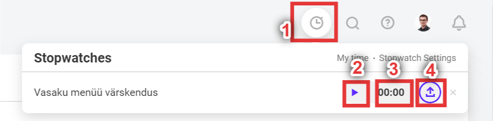Lisaks on ActiveCollabi paremal pool üleval, päises, näha jooksvaid või pausil olevaid stoppereid. Kui mõni stopper jookseb, siis seal jookseb ka aeg.